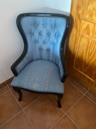 Elegante silla de estilo vintage con un diseño clásico y refinado. (Negociable) - Tapicería de tela en tono azul con detalles. - Estructura de madera con acabado negro. - Respaldo alto con botones. - Patas curvas.