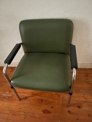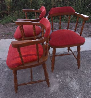 Años 60-70 Tres sillas de madera con acolchado verde. Tendrán unos 50 años, están muy bien conservadas aunque con algunas pequeñas marcas en la madera (inevitable por el paso del tiempo) y a una le falta un palito que une las patas (no es importante) . La parte del tapizado está muy bien. Con buena mano y una pequeña restauración quedarán ideales para dar un toque vintage a cualquier ambiente. 10€ cada una La medidas que pone es para el envío de las tres sillas en un solo bulto.