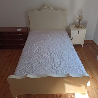 Muebles habitación vintage restaurados, cama, mesilla y dos sillas Color blanco Medidas Cama: 180x105 cm; alto cabecero 110 cm; alto pies 60 cm Mesilla: alto 58 cm; ancho 42.5 cm; profundo 31 cm Sillas: alto total 86 cm; alto asiento 47 cm; ancho 35 cm; profundo 36 cm Desmontaje y trasporte a cuenta del comprador