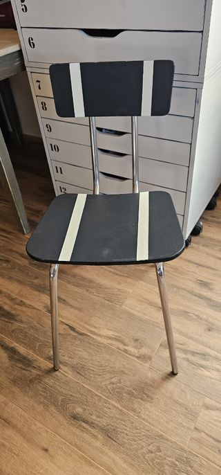 Preciosa silla de formica restaurada. Se encuentra en muy buen estado y es muy muy chula. - Diseño retro con patas metálicas. - Acabado en blanco y negro.