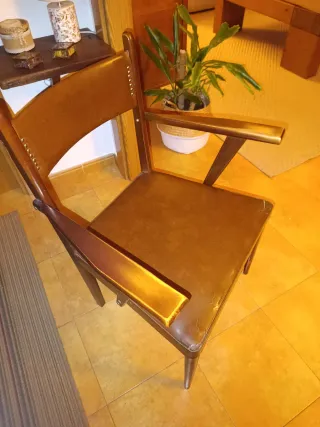 VENTA EN PERSONA EN 24h EN BURGOS Y EL FIN DE SEMANA EN PALENCIA/LEON/VALLADOLID/MADRID/VITORIA. Silla de estilo clásico en madera maciza, con acabado en tono nogal. El respaldo incluye detalle de barrotes torneados, dando un toque elegante y vintage. El asiento está tapizado en piel sintética marrón, cómoda y fácil de limpiar. Dispongo de 3 unidades. 1 x 20 € 2 x 35 € 3 x 45 €