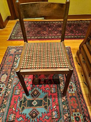 Silla remodelada recientemente por una pequeña tienda familiar. Cambio de tapiceria a tela moderna. En perfectas condiciones. Hecha bajo pedido para combinacion de otros muebles de similar tono y entorno. Posibilidad de comprar las dos. Comprando ambas 110 euros las dos.