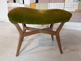 Calzadora vintage con patas de madera y tapizada en terciopelo verde