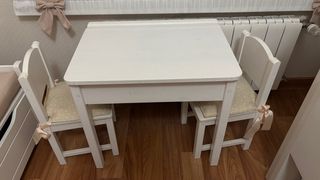 Vendo este conjunto por no usarse ya. Esta en muy buen estado y con poco uso. Las medidas de la mesa son 55cm alto, 45 de fondo y 60cm de ancho. las sillas algo menos