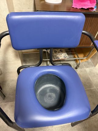 Silla de baño con asiento acolchado. - Estructura de metal resistente. - Asiento y respaldo de plástico azul.