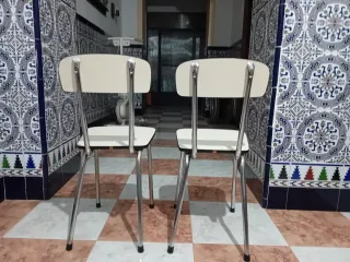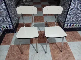 Se venden dos sillas de cocina con estructura metálica y asientos de aglomerado. - Diseño moderno y funcional. - Patas de metal plateado. - Asientos y respaldos en color beige.