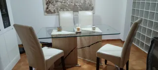 Mesa de cristal y 4 sillas blancas