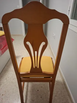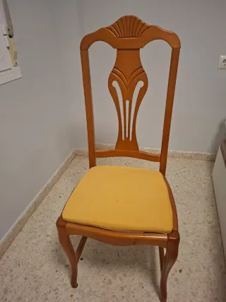Sillas de madera tapizadas acolchadas. Se venden juntas o separadas. Hay un total de 6. 12€ cada una, se hace precio si se compran en conjunto.