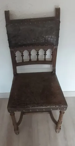 Elegante silla antigua con un diseño clásico. - Asiento y respaldo tapizados en cuero. - Estructura de madera robusta. - Detalles ornamentales en el respaldo.Para restaurar