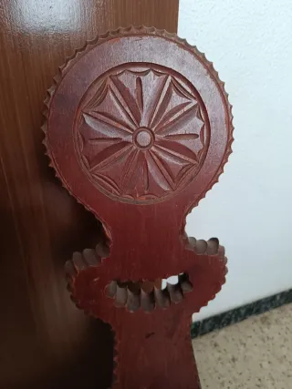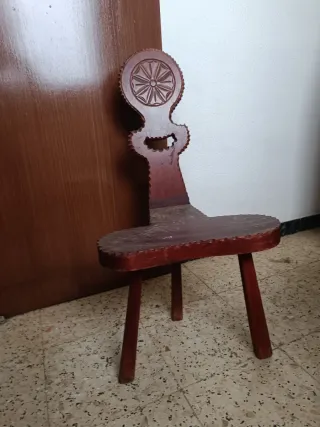 Dos sillas antiguas con un diseño único y tres patas. - Fabricada en madera. - Detalle tallado en el respaldo con forma de rueda. - Bordes del asiento festoneados.