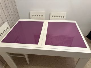 Conjunto de mesa y seis sillas para el salón o comedor. Mesa extensible - Mesa con sobre de cristal morado. - Estructura de las sillas y mesa en blanco.