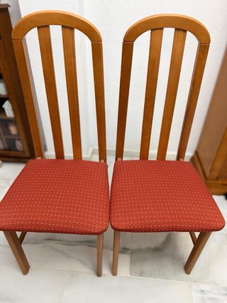 Conjunto de seis sillas de madera con asientos tapizados en tela. No mareantes, es su precio, si no lo puedes pagar,no molestes con ofertas absurdas. - Estructura de madera robusta. - Asientos de tela en color naranja. - Diseño clásico y elegante.