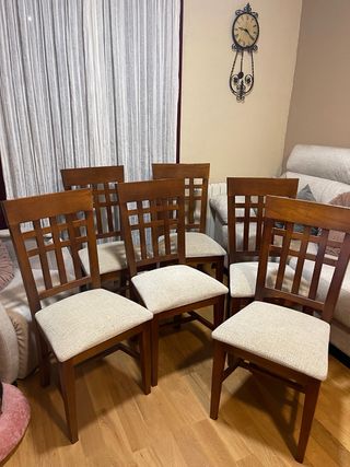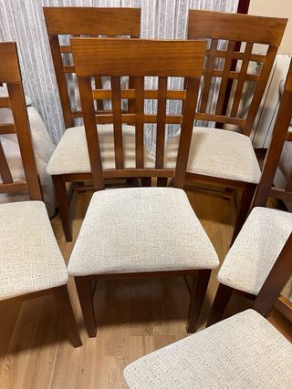 Conjunto de sillas de comedor con un diseño elegante y práctico. 250€ las 6 sillas. O 50€ Cada una. - Estructura de madera resistente. - Asientos tapizados en tejido antinanchas. - Color beige y marrón.