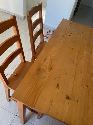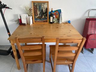 Conjunto de mesa de madera con cuatro sillas. - Mesa de madera de 75x115cm. - Incluye 4 sillas de madera.