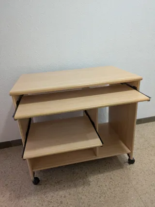 Mesa auxiliar para ordenador con silla tapizadade color azul regulable en altura. Recoger en Baix Guinardó-Can Baró (08024 Barcelona).