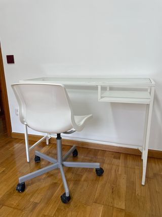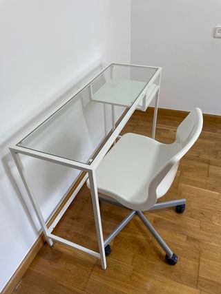 Conjunto de escritorio con superficie de cristal y una silla. - Estructura del escritorio en metal. - Silla con base de plástico y ruedas. Hay 3 juegos de escritorios con sillas disponibles (20€ cada uno)