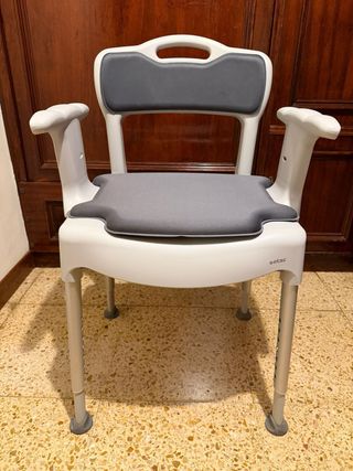 Silla de ducha Etac Swift con asiento y respaldo acolchados. - Asiento y respaldo con tapicería gris. - Patas ajustables en altura. - Brazos de soporte. - Diseño ergonómico.
