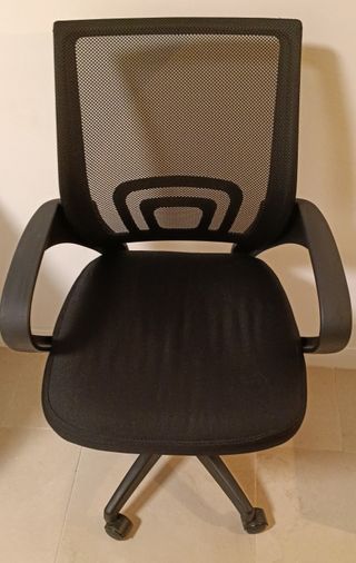 Silla de oficina con diseño ergonómico y base con ruedas para facilitar el movimiento. - Respaldo de malla transpirable. - Asiento acolchado y elevable. - Brazos curvos. Funciona correctamente tanto las ruedas como el asiento. Precio barato porque urge su venta.