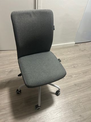 Silla de escritorio estilo sueco con base giratoria y ruedas. Se aprecian desperfectos en la foto.