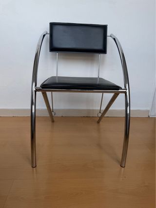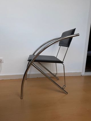 Silla con un diseño moderno y elegante. - Estructura de metal cromado. - Asiento y respaldo en piel sintética negra.