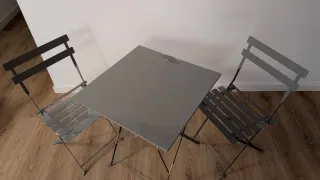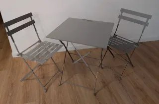 Conjunto de mesa y dos sillas plegables para terraza o balcón. Fabricadas en hierro, son ideales para espacios exteriores. - Diseño moderno y funcional. - Fácil de guardar y transportar. Nuevo, Están con plásticos aún, no se a estrenado. Mesa 60x60