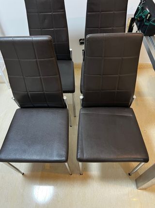 Conjunto de cuatro sillas de comedor con un diseño moderno y elegante. - Tapicería en piel sintética de color marrón. - Patas de metal plateado. - Respaldo alto con diseño acolchado.