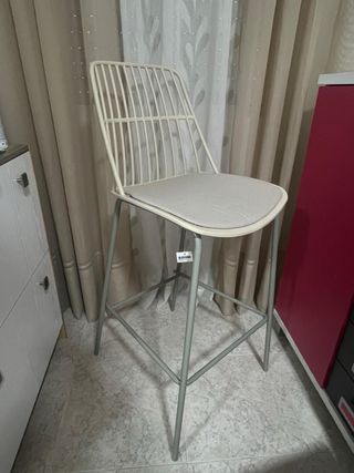 Silla alta con un diseño moderno y elegante. - Estructura metálica resistente. - Asiento tapizado en tela. - Respaldo con diseño de barras.