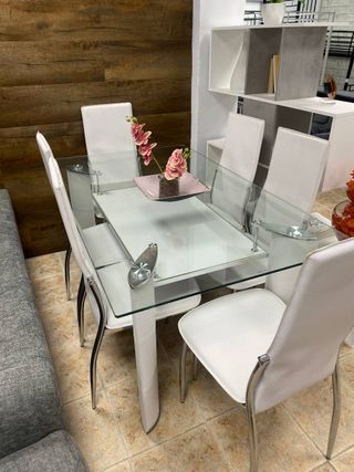 Mesa y 6 Sillas Comedor Cristal y Piel