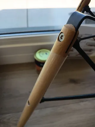 Conjunto de patas para sillas estilo Eames, con un diseño nórdico que combina madera y metal. - Patas cónicas de madera. - Base de metal negro.