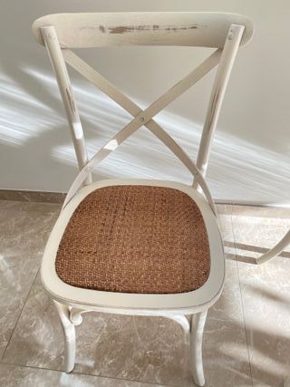 Conjunto de sillas estilo bistró con un acabado blanco antiguo y asiento de ratán. - Diseño cruzado en el respaldo. - Patas delanteras curvas.