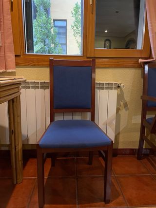 Conjunto de cinco sillas de salón con asientos y respaldos tapizados en tela azul y estructura de madera. - Tapicería de tela azul. - Estructura de madera marrón. 10€ por silla o 40€ por el conjunto de 5