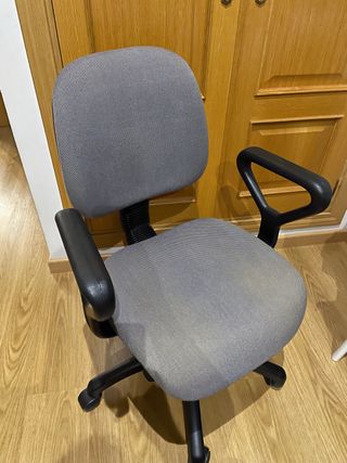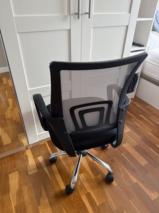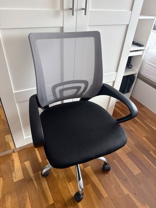 Silla de oficina con respaldo de malla transpirable y asiento acolchado. - Respaldo de malla gris. - Asiento de tela negra. - Base metálica con ruedas. buen estado, entrega inmediata en la zona
