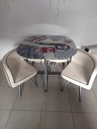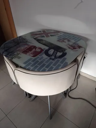 Conjunto de mesa de salón con diseño moderno y cuatro sillas a juego. - Mesa con tapa decorada con motivos de Londres. - Estructura de las sillas y mesa metálica. - Tapicería de las sillas en color blanco con ribete negro.