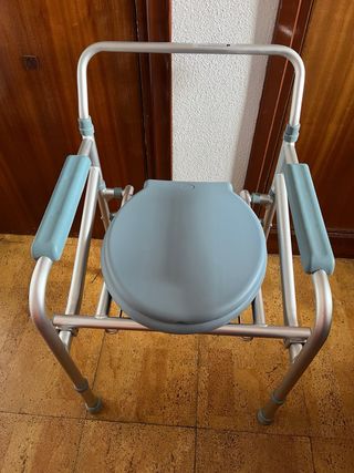 Silla con inodoro incorporado, como nuevo. Asiento y tapa en color gris azulado. Patas ajustable.