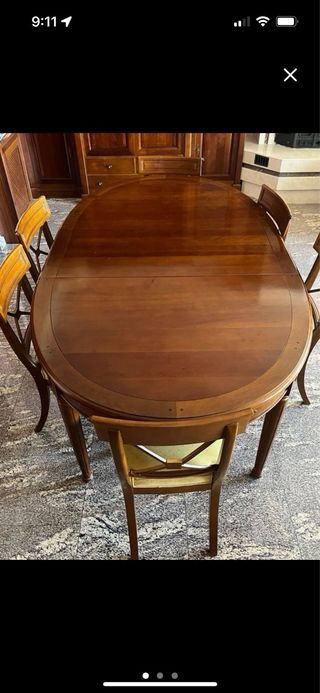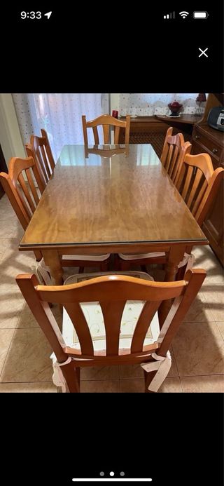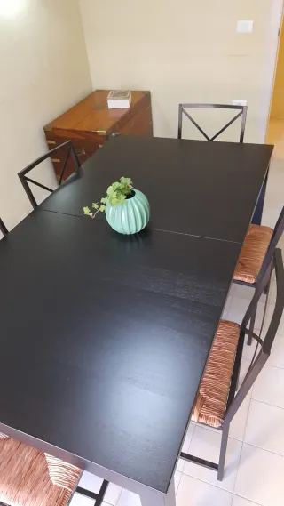 Conjunto de mesa de comedor con seis sillas a juego. La mesa es extensible para adaptarse a tus necesidades. En perfecto estado se cambia por renovación. - Medidas de la mesa: 90x140 cm. - Medidas de la mesa extendida: 90x220 cm. - Incluye 6 sillas.