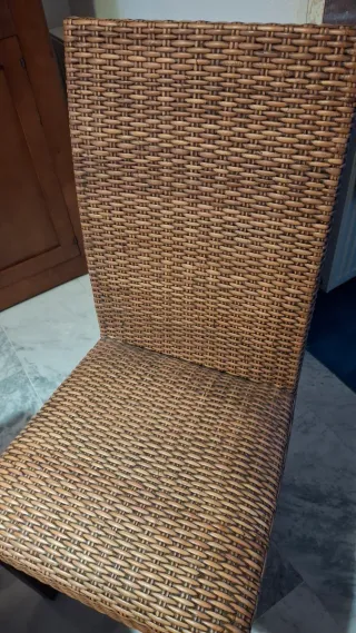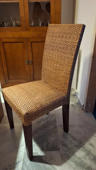 Conjunto de cuatro sillas de comedor con un diseño elegante y natural. - Estructura de madera robusta. - Asiento y respaldo tejidos en fibra natural.