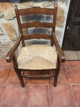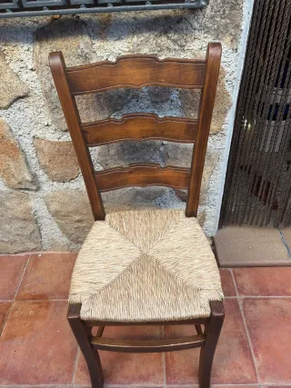 Silla de madera maciza con asiento de enea. Muy estable, sin cimbreo. Buen estado general. Ideal para comedor, cocina o casa rural. Se pueden ver sin compromiso. Precio por unidad / descuento por lote.