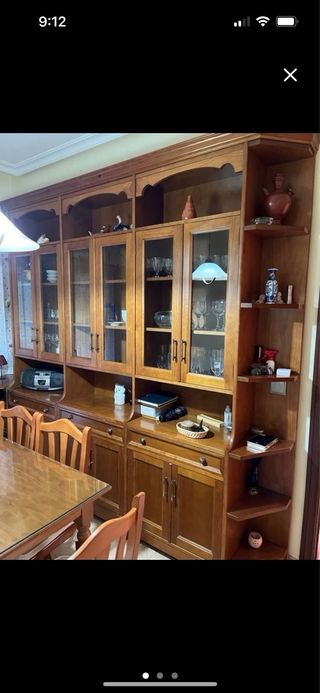 Conjunto de mesa de comedor con seis sillas y una vitrina a juego. La mesa tiene una superficie de cristal y patas de madera. - Mesa de comedor con tapa de cristal. - Seis sillas de madera. - Vitrina a juego.