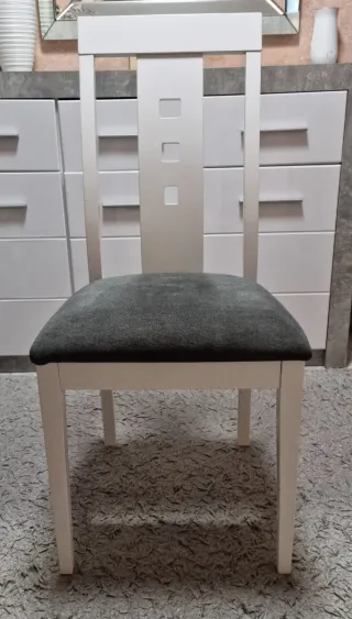Silla de comedor con un diseño moderno. - Patas de madera blanca. - Asiento tapizado en tela gris. - Respaldo con detalles cuadrados. * Se disponen de 4 en venta