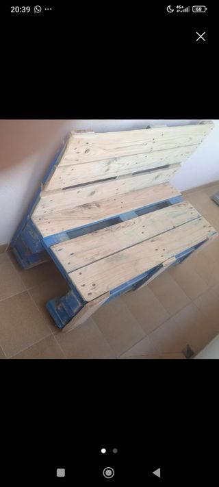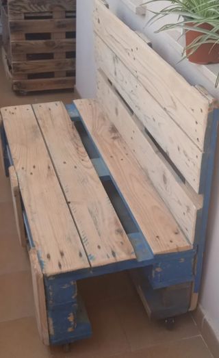 Banco hecho a mano con palets, ideal para exteriores o interiores. - Diseño rústico y moderno. - Combinación de colores azul y marrón.