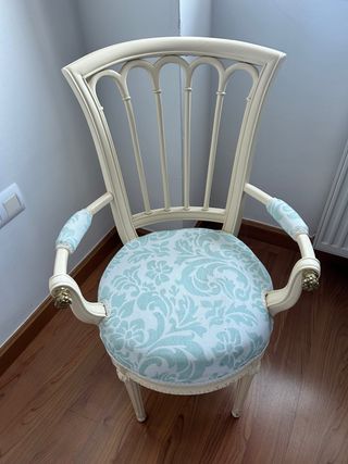 Elegantes sillas con un diseño clásico y refinado, estilo francés Luis XVI. Son perfectas para añadir un toque de distinción a cualquier espacio. - Tapicería en piel sintética de color gris. - Estructura de madera con acabado plateado desgastado. Tengo 6 unidades. El precio es por unidad. El conjunto de 6= 390 €