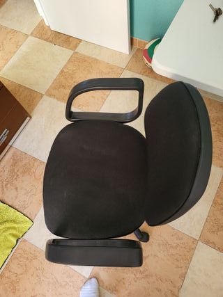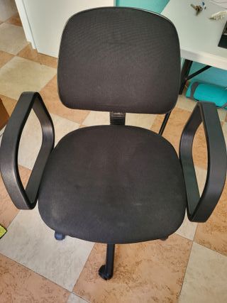 Silla de oficina negra con reposabrazos Vendo silla de oficina/gaming comoda, ideal para trabajar desde casa o en oficina. Tapizado: tela negra, resistente Respaldo: altura media, buen soporte Reposabrazos: regulables, comodos Base: 5 ruedas, se desplaza facilmente Asiento: altura regulable con elevacion neumatica Estado: muy bueno, todo funciona perfectamente