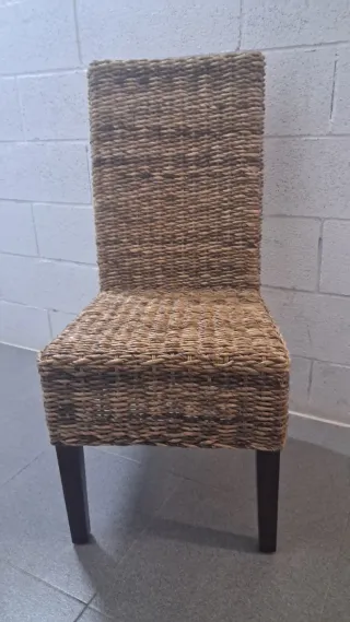 Conjunto de cuatro sillas de comedor con un diseño orgánico y acogedor. - Estructura tejida en fibra natural. - Patas de madera oscura. Todas en perfecto estado. Altura 100 cm, largo y ancho 47 cm. Precio es 50 euros por silla. Comprando 4 sillas - 20% descuento!