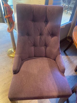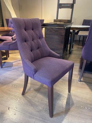 Elegante silla de comedor con un diseño clásico y confortable. - Tapicería de tela en tono morado. - Patas de madera oscura. - Respaldo con capitoné.