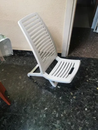Conjunto de sillas de terraza. Las sillas son de plástico resistente.5 sillas 10€ y todos los cojines 10€ - Sillas apilables para ahorrar espacio