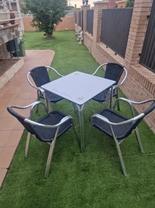 Conjunto de mesa de comedor con superficie de cristal y estructura aluminio, hecha a medida, muy robusta y en buenas condiciones. Acompañado de seis sillas con marcas de uso pero son funcionales. - Mesa de 164 x 94 cm. 200 e - 6 sillas, NO se incluye el cojin. 50 e el conjunto de 6 sillas.