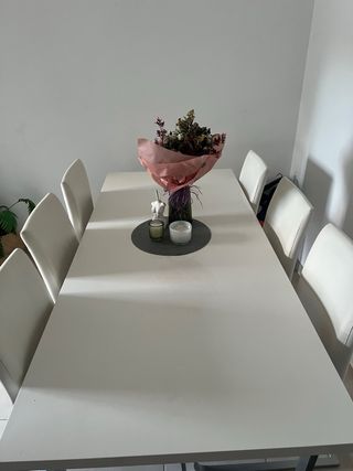 Conjunto de mesa de comedor con seis sillas. - Mesa espaciosa con superficie lisa. - Sillas tapizadas en color blanco. - las sillas se balancean - se puede vender por separado sino se quiere todo el conjunto -precio sillas por separado 30 euros cada una - precio negociable mesa y sillas
