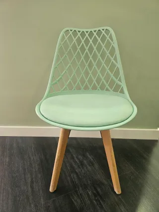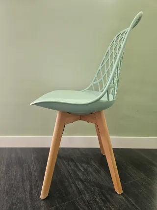 Silla de diseño con asiento en polipropileno y patas de madera. - Diseño moderno y ligero. - Base de cuatro patas de madera natural. Tenemos 4 sillas (precio por unidad).