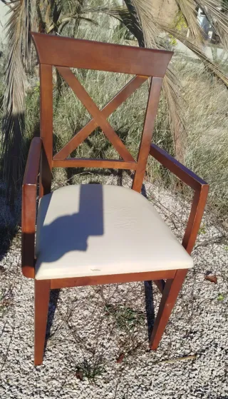 Silla de comedor o auxiliar con un diseño clásico y elegante. Perfecta para añadir un toque de estilo a cualquier espacio. - Estructura de madera robusta. - Asiento tapizado en piel de color beige. - Reposabrazos para mayor comodidad. El asiento está agrietado por lo que hay arreglarlo. Pero las sillas está fuerte y en muy buen estado