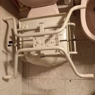 PRECIO NEGOCIABLE Silla auxiliar para el baño, diseñada para facilitar acceso y movilidad en la bañera. - Giratoria (360o y 4 posiciones). - Estructura de metal y plástico (polietileno). - Se fija con roscas ajustables a la mediade de la bañera. - Asiento: 44 cm de ancho x 40cm de profundo Ancho exterior: 71 cm. Ancho interior: 49 cm Profundidad: 54 cm Peso Neto: 5,9 kg Peso máximo soportado: 120 Kg - Color blanco.